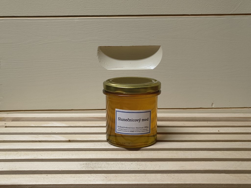 Květový med z oblasti slunečnicových polí stočený po odkvětu slunečnice.